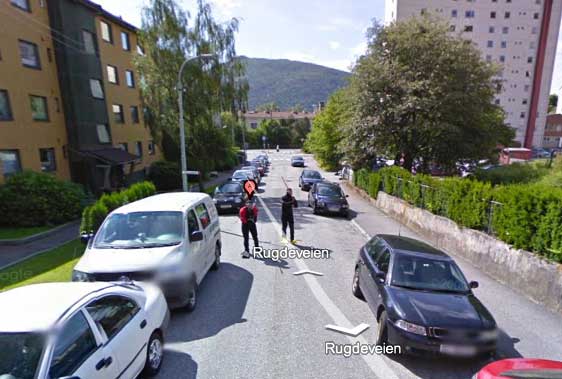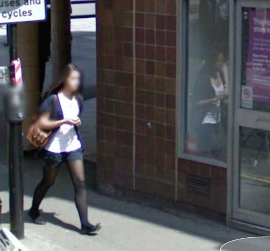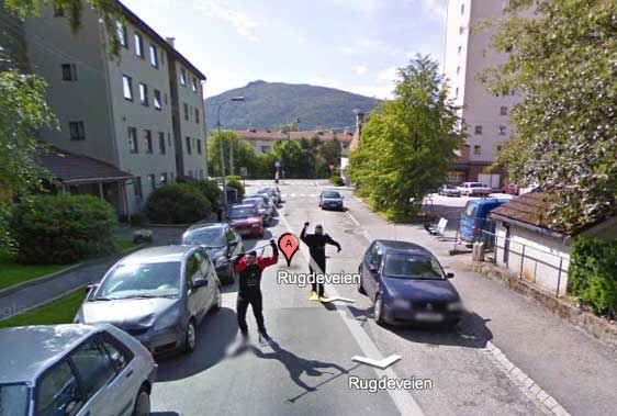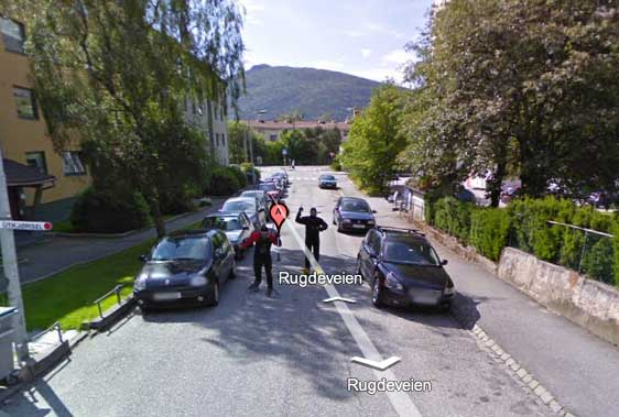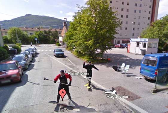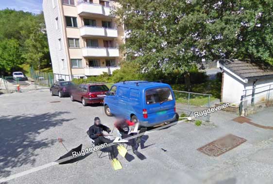 Google does it’s best to protect our privacy by blurring the faces of all people and by dignifying the clothing of loose women 1 but still some people get angry and wayward when a google street view car passes by. Sometimes this rage is understandable. Imagine you and a good friend are just enjoying the sun, reading a newspaper and drinking a cup of coffee on your favorite spot in the city, the entrance to a parking lot and suddenly this car with an allmighty eye on top of it comes by and takes pictures of you without asking! I would be throwing spears at it if I had them with me 2.